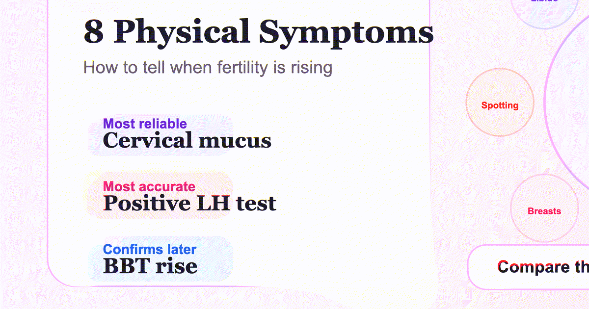 This complete guide walks through the 8 most-discussed signs of ovulation in women, from the most reliable physical sign, cervical mucus, to more variable clues such as light spotting and increased sex drive. Each section explains what the sign looks like, how useful it is, and how it fits before, during, or after ovulation. → Jump to the reliability comparison chart → Use our free Ovulation Calculator